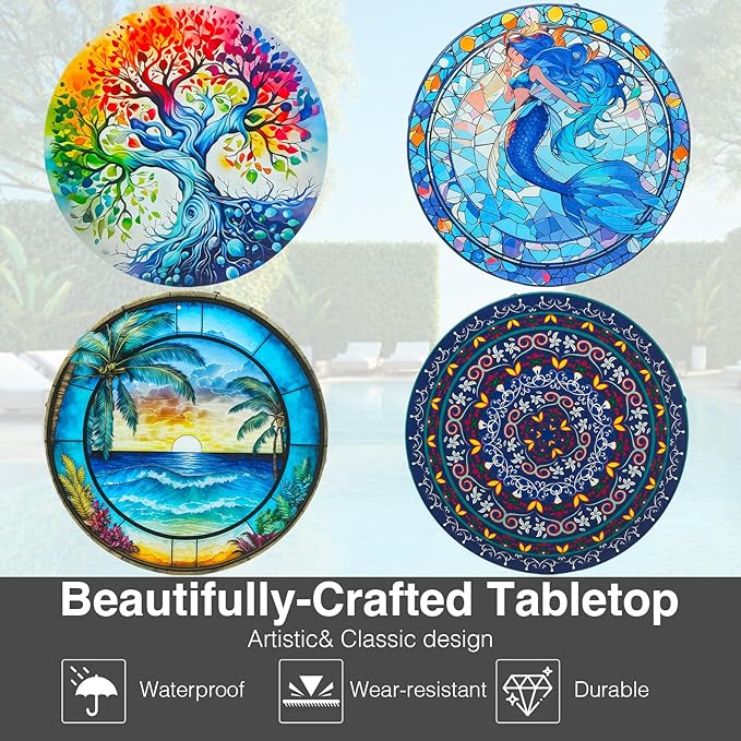- 🌿High Quality Metal Patio Side Table: This metal side table top offers a stunning blend of colorful top with an elegantly curved black steel frame, blending with any room decor. With rust-proof coating design, it is fit perfectly into the outdoor environment. Easy to assemble