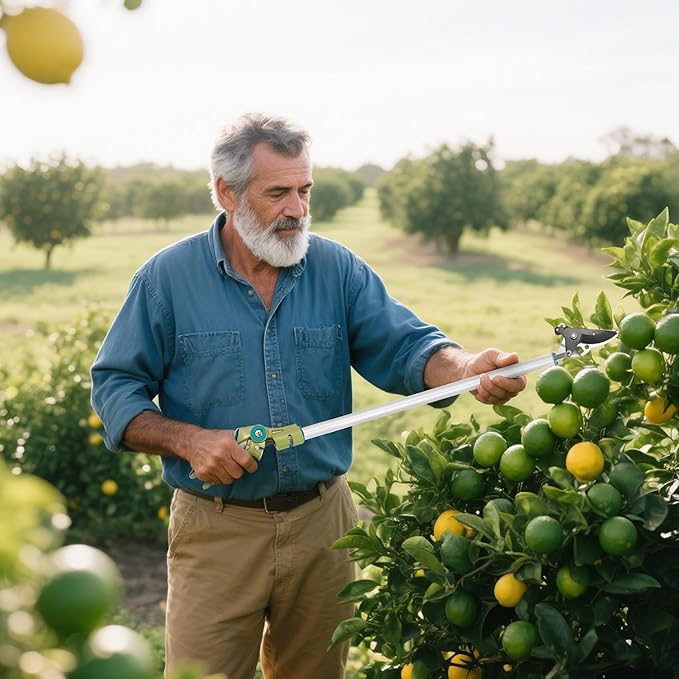- [Cut & Hold Pole Pruner for Easy Tree Trimming] Reach farther and prune smarter with this lightweight long reach pruner. With a 32" extension, you can trim branches high above, cut shrubs at eye level, or snip low growth without bending down. The cut & hold design grips branches, flowers, or fruit securely, so nothing drops—perfect as a fruit picker for lemons, oranges, apples, and for safe shrub and bush trimming without ladders.