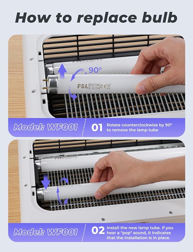 - Cutting your budget: with a longer lifetime and accurate mosquito luring. The fluorescent light tube produces 80% more UVA energy. You can rely on effective performance for the life of the bulb