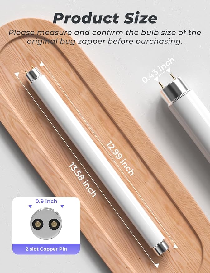 - Perfect Replacement: 10W replacement bulbs compatible with most 20W machines. Comes with a 2-pack of T8 Fluorescent Mosquito Lure Light Tubes, each 10W. The item size is 13.62 x 0.98 inches (L x W). Kind reminder: please check your original bulb's size and pin to make sure fits your machine