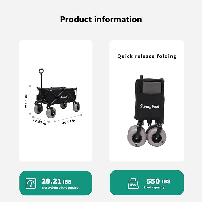 SUNNYFEEL 41''L 550lbs Heavy Duty Beach Wagon with 9" Balloon Tires, 200L Fold Up Wagon Cart Foldable with Side Pocket and Brakes for Camping Sports Garden Shopping (Black)