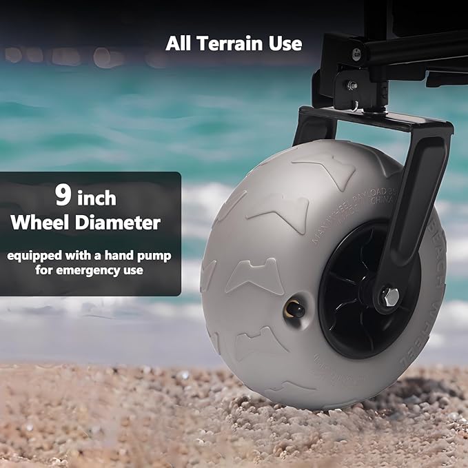 - 【9" Balloon Tires】-The beach wagon is adopted 9-inch balloon tires for better riding experience. Inflatable tires undergo 24-hour quality inspection and come with a manual pump for emergency use.