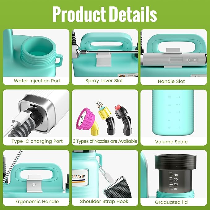 - 【Multi-Functional Alternative to Garden Hose Sprayers】Why bother with a garden hose sprayer? This electric sprayer can be used for watering plants, applying herbicides, or deep-cleaning patios. Its leak-proof seal design and durable construction make it more reliable than seasonal backpack sprayers and watering cans.