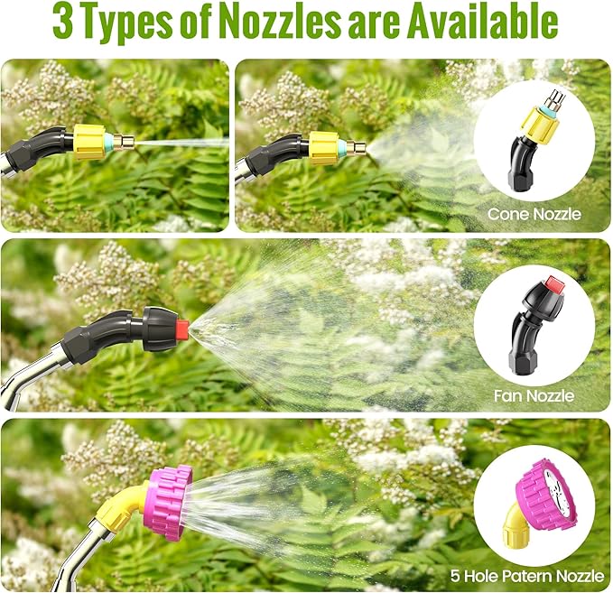 - 【3 Nozzles + Adjustable Telescopic Spray Bar】Customize spray effects with 3 nozzles: the mist nozzle is ideal for seedlings, the shower nozzle for shrubs, and the jet nozzle for deep cleaning. The adjustable telescopic spray bar extends from 12 inches to 24 inches, enabling precise spraying of high branches or ground weeds.