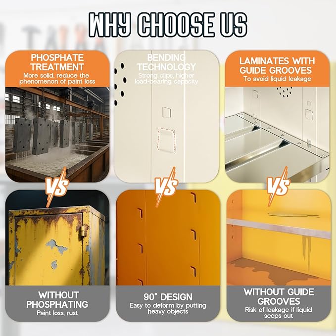 - Durable Steel Build: Chemical storage cabinet is made of double-layer cold-rolled steel with phosphating for better paint adhesion. Adjustable galvanized shelves with a buckle design ensure strong load capacity