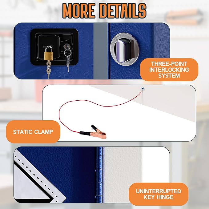 - Enhanced Safety Features: Flammable storage cabinet includes spill-proof shelves, three-point lock, 2inch/50mm sump, dual vent ports with flame arresters, and a grounding conductor to reduce static risks