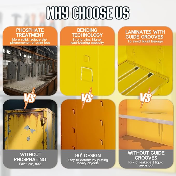 - Durable Construction: Chemical storage cabinet is made of double-layer cold-rolled steel with phosphating for durability. Adjustable galvanized shelves with bending and buckle design ensure strong load capacity