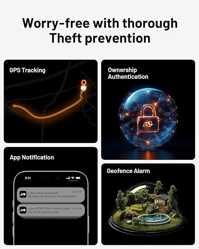 - Anti-Theft Features: LUBA offers GPS tracking and anti-theft protection, providing users with peace of mind by enabling them to track its location. It supports a "lost" feature that prevents unauthorized use. Once activated, the first user becomes the rightful owner and can grant access to family members. Additionally, if LUBA exceeds designated mowing zones, the user will receive an app notification.