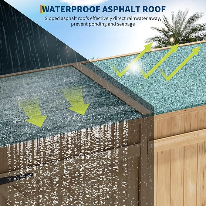 - 【Waterproof Storage】Storage cabinet featuring a sloping asphalt roof, not only does it accelerate the natural drainage of rainwater or melted snow, preventing water accumulation that can lead to leaks or structural damage, but it also resists UV radiation, extending the service life of tool storage cabinets.