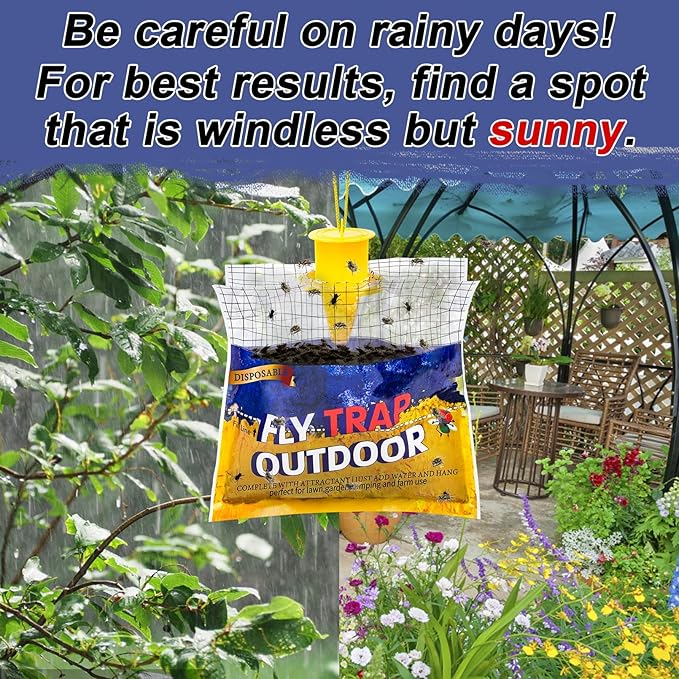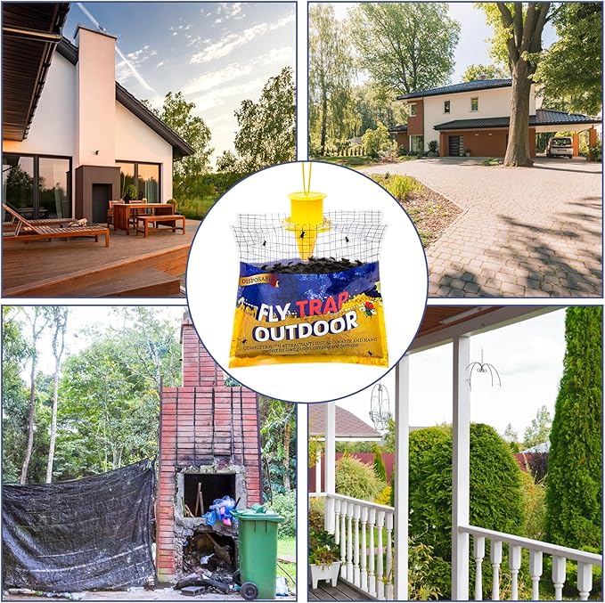 - Disposable fly traps bags hanging: science has proved that flies prefer yellow and blue, so the new fly repellent package to efficiently attract. Secondly, through the taste of outdoor fly trap natural fly bait, which is difficult for us to accept, but flies cannot resist