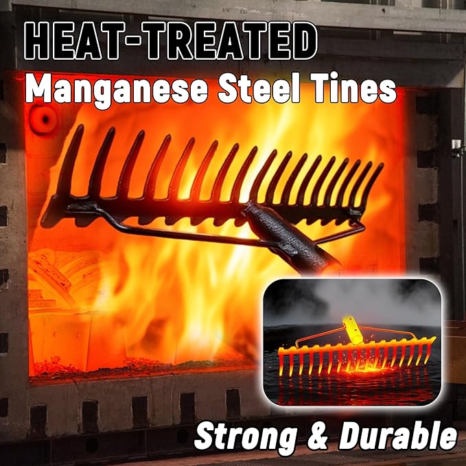- Built for Long Term Durability: The bow rake head is forged from heat-treated manganese steel, giving it high hardness and wear resistance. 17 solid tines are welded securely to the bow frame, forming a structure that resists bending and loosening. A sturdy steel handle completes the design, allowing this garden rake to withstand repeated gardening, lawn care, and outdoor work season after season.