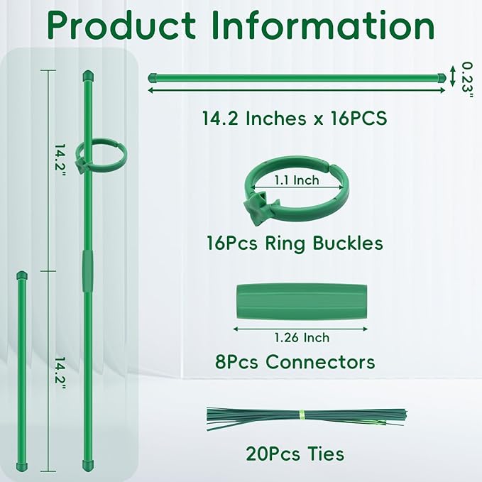 - 【Complete Package for Convenience】- Includes 16pcs durable fiberglass plant stakes, each measuring 14.2 inches, along with 8 connectors,16 Ring Buckles and 20 Ties for versatile and effective plant support.
