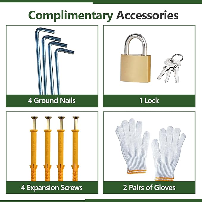 - Material: The garden tool storage is constructed with high-quality galvanized steel and upgraded 0.25mm thick panels for excellent corrosion resistance, waterproofing, and wind resistance, ensuring long-term durability in harsh outdoor environments