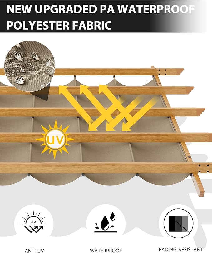 10x13 Ft Outdoor Retractable Pergola with Adjustable Roof Modern Metal Patio Gazebo, Upgraded Faux Wood Grain Aluminum Pergola for Deck, Backyard Gardens, Porches, Grapevines, Khaki