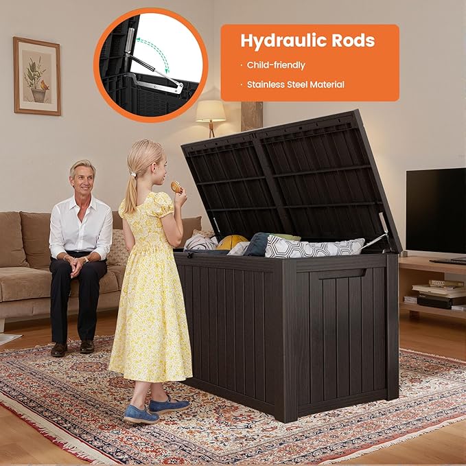- Safety-First Design: The outdoor storage box features a hydraulic lever mechanism for safe operation, eliminating the risk of pinching fingers. It also includes a detachable internal partition for organized storage