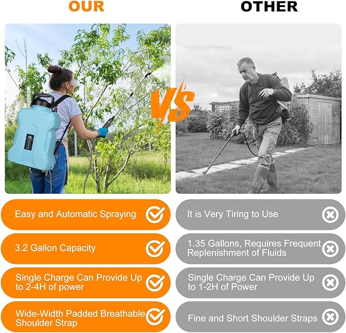 - 【Easy Operation Pump Sprayer】Simply press the button for instant, continuous spray – no manual pumping required. This pump sprayer 2.1 gallon, features include a transparent tank with level markings, quick-detach nozzles for easy cleaning, USB rechargeability, and a lightweight design for comfortable handling, superior to traditional garden sprayers pump.