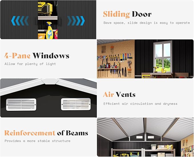 - Bright & Well-Ventilated: Equipped with two 4-pane windows and built-in vents, this metal shed brings in natural light and airflow, reducing dampness, odors, and condensation to keep your tools and firewood dry