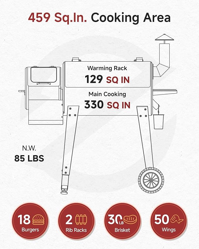 - Durable & Portable-- Sturdy steel construction with a high-temperature powder coating finish makes the pellet grill long-lasting. Lift the left side to roll smoothly on the right wheels, then lower the left legs to lock securely in place.