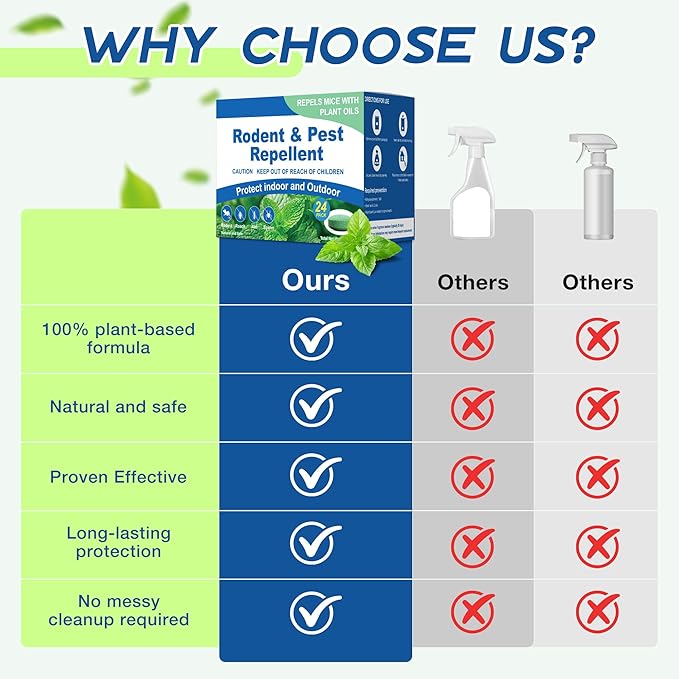 - 【Safe and Environmentally Friendly】Made with peppermint oil for mice, our natural mouse repellent is safe for humans and pets, effectively keeping rodents at bay. No harmful chemicals are used, making it an eco-friendly option.