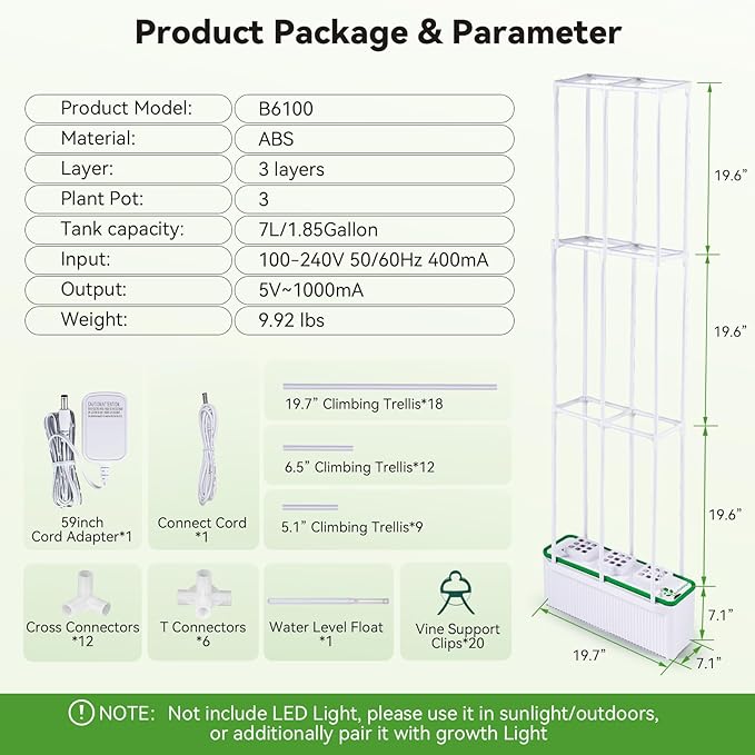 - Space-Saving & Expandable Vertical Design -- Our indoor gardening system features a 3-tier climbing trellis (each 19.6inch tall), perfect for small spaces like apartments, kitchens, or balconies, helping you grow vine plants like tomatoes, cucumbers, pole beans and more. Unlike traditional ones, our hydroponics tower allows unlimited expansion. Simply connect multiple units to build your hydroponic garden