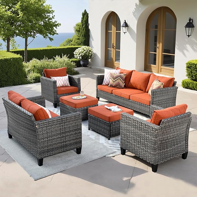 ovios Patio Furniture Set, 6 Pieces Outdoor Wicker Sofa Couch with Loveseat, Ottomans and Comfy Cushions, All Weather High Back Rattan Conversation Set, Orange Red