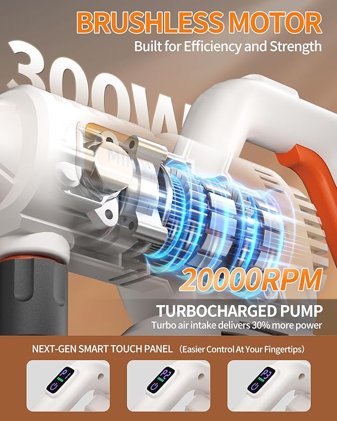 - StormForce 1200 PSI Brushless Motor: Driven by an upgraded 3820 pure-copper brushless motor, this 400 W cordless car wash portable pressure washer delivers 1200 PSI āover ten times the pressure of a standard hose. The integrated LCD control panel of our battery pressure washer cordless offers three precisely calibrated modes, letting you dial in gentle rinse or deep-scrub force on demand, dealing with everything from windows, cars, to bricks.