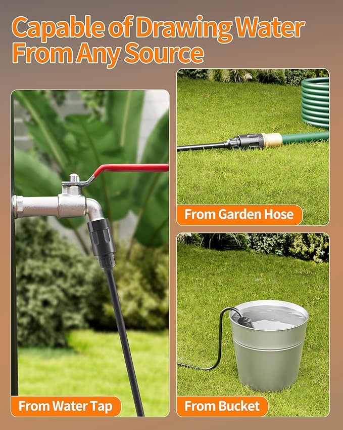 - Draw Water Easily from Any Sources: Our water pressure washer comes with a weighted, intake filter that dives fast and screens grit, leaves and sand, pumping clean water straight from rivers, creeks, pools or a five-gallon bucket. When a faucet or garden hose is handy, clip on the included NPT, GHT or slip-on rubber collar in our car wash machine kit and snap into any garden hose or smooth outdoor tap in seconds. Youāll always find a water supply with accessories in our battery power washer.