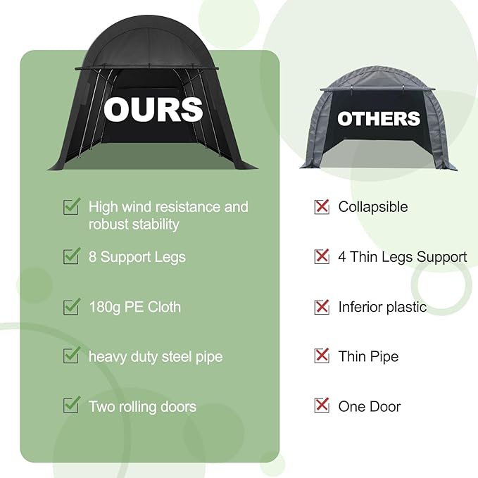 - ✅ 【Round Style Roof & Anti-Snow Waterproof】 Car tent features a round roof design and 180g PE waterproof tarpaulin, effectively reducing wind resistance and allowing for quick drainage to prevent water and snow accumulation, thereby extending the lifespan of the carport.
