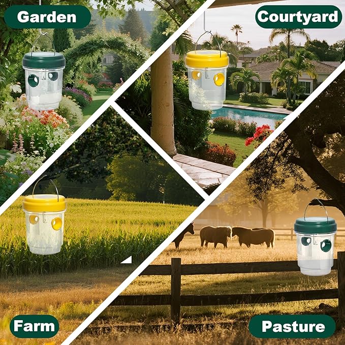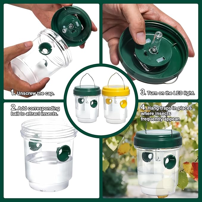 - Easy to Use: Simply add corresponding bait, hang our products in your garden, patio, or backyard and let it do the rest. At night, the built-in LED light that automatically turns on at night, making it more effective at attracting insects in the dark. Can be reused after cleaning, this wasp catcher offers a cost-effective and long-lasting solution to your insect problems
