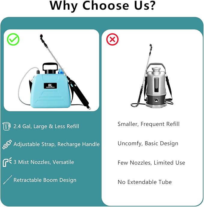 - 🛡️ Rugged, Ergonomic, and Built to Last: Made of durable HDPE and ABS materials, this 2.4-gallon sprayer withstands tough outdoor and indoor use. The ergonomic handle ensures a comfortable grip during long periods, while the integrated filter prevents clogs for consistent performance. Built tough to be your reliable spraying companion for years to come