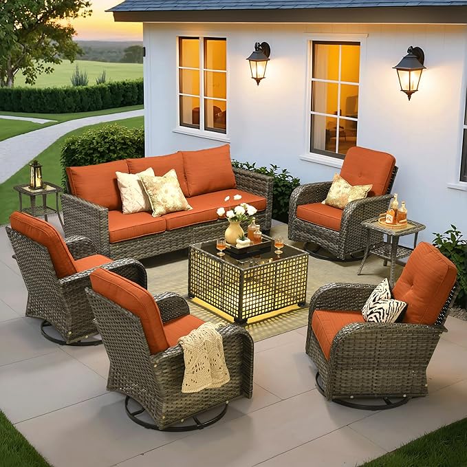 ovios 8 Pieces Patio Furniture Set, Outdoor Wicker Sofa Couch with Rocking Swivel Chairs Solar Lights Table, Modern Deep Seat Rattan Conversation Sets for Porch Deck, Orange Red