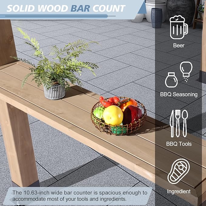 - BAR COUNTER DESIGN — The bar counter of this wood grill shed is expertly designed to hold barbecue seasonings, fresh ingredients, and dining utensils. Its spacious and thoughtful layout keeps everything within easy reach, enhancing convenience and enjoyment during your grilling sessions.