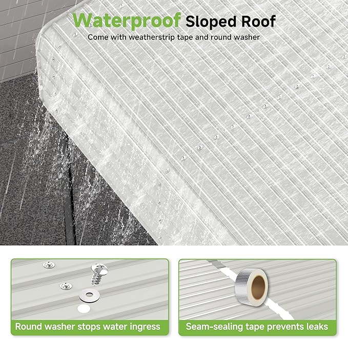 - Waterproof Metal Roof: Combines waterproof tape, metal washer screws, and a sloped design for maximum water resistance and fast drainage