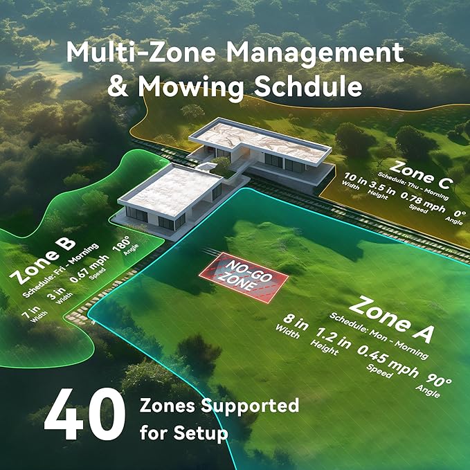 - 0.75 Acre. Yes. Just One Mower: Thanks to powerful vision and spatial fusion technology, the mower can "understand" its surroundings like human eyes. It supports edge mapping of up to 0.75 acre (32,670 sq.ft / 3000ć”) and ensures consistently centimeter-accurate positioning. Users can customize 40 working areas via the app and define no-go zones such as pools, flower beds, and play areas, all of which are accurately recognized. Daily lawn care becomes effortless with the schedule function.