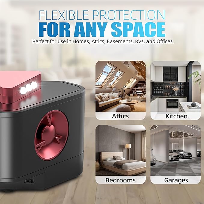 - 【360°WIDE-ANGLE COVERAGE】Our squirrel repellent has an excellent 360 ° coverage angle and barrier,and the ultrasonic coverage area is up to 3,400 sq.ft.,ensuring that ultrasound can reach every corner of the room.With this ultrasonic pest repeller,let your family feel truly at ease.