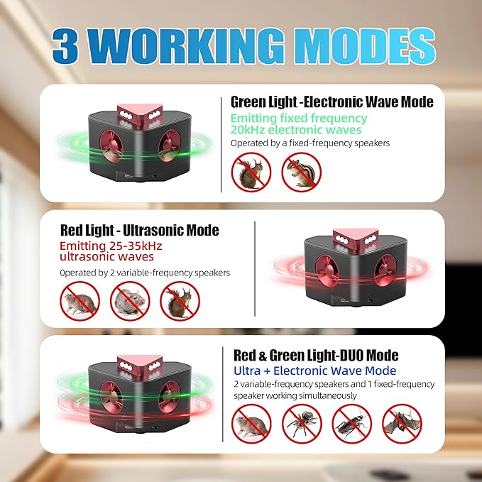 - 【NEW UPGRADE IN 2025】Our upgraded version of the ultrasonic mouse repellent plug in has 3 working modes: electronic wave mode(green light),ultrasonic mode(red light)and dual mode.You can choose the appropriate mode according to the indoor rat infestation.There are no complicated settings,just connect the power supply and the red&green light is on to indicate that it is working.