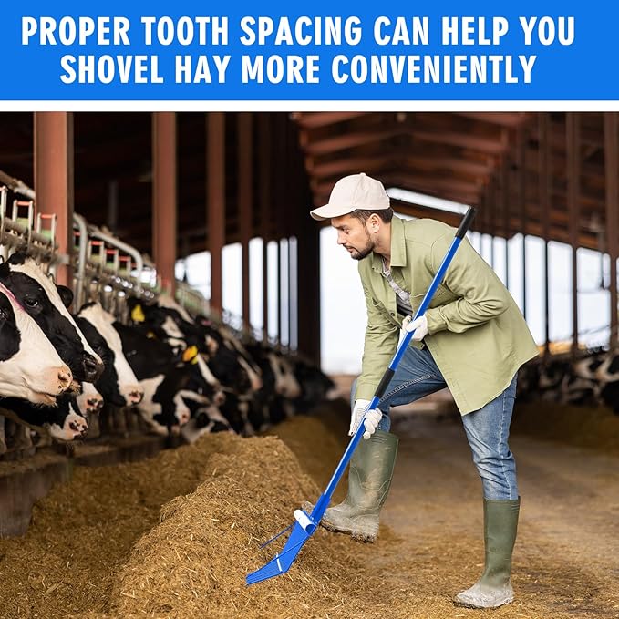 - Efficient Cleaning for Time Saving: our gardening forks feature 20 fine tines design with a tooth pitch of 0.59 inches that ensures efficient cleaning; The slanted design at both ends of the manure fork prevents manure from overflowing, making your farming operations much easier and faster-saving you precious time and energy