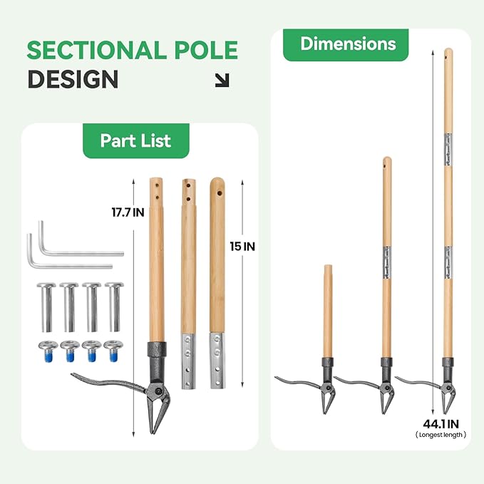 - 【Easy to Clean & Store 】After use, simply rinse the steel head with water to remove dirt—no tedious scrubbing required. Our weeding tool features a handle that splits into three parts.The compact size fits in most garden tool sheds or garage corners. A hanging hole at the base of the handle allows for convenient wall storage, saving space and keeping your tools organized.