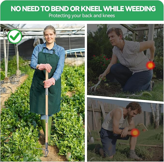 - 【No More Bending or Kneeling】Tired of back pain from stooping to pull weeds? Our manual weeder features an extended 44-inch bamboo handle and a leverage-driven design, letting you remove deep-rooted weeds (dandelions, thistles, crabgrass) while standing upright. Save time and protect your joints—perfect for seniors, garden enthusiasts, and large-yard maintenance.