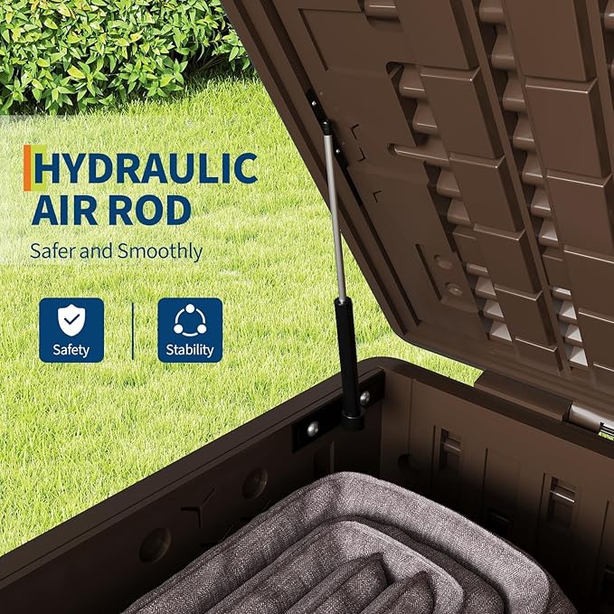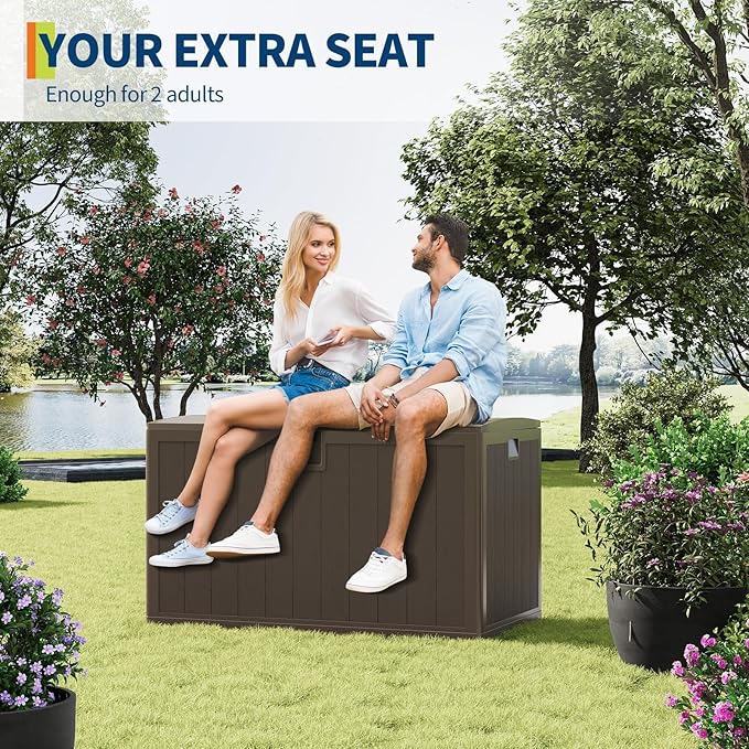 - 【All-weather Durability】Made of sturdy resin with a natural wood grain appearance, this deck box can perfectly resist rain penetration and strong sunlight. Whether it is the hot summer or the rain and snow in the cold winter, your gardening tools and outdoor products can be fully protected. The special material ensures that the box will not crack or fade, and it can maintain its beauty with a simple daily wipe, allowing you to enjoy a worry-free and long-lasting outdoor storage experience.