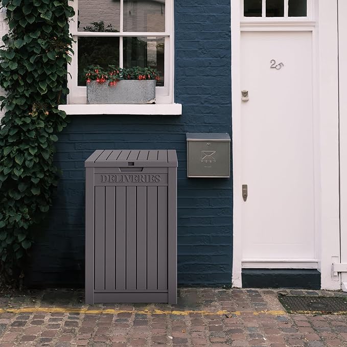 - 【Warm Coffee-Tone Design】 With 55 gallons of storage space (16"L x 16"W x 33"H), this coffee resin deck box complements wooden decks and farmhouse-style patios. The lockable lid protects packages, lawn tools, and outdoor essentials.