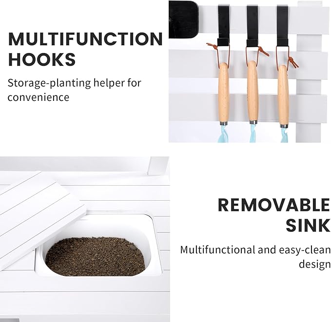 - EXTRA STORAGE SPACE: Our garden workbench offers a variety of storage space. There is a large shelf underneath that works well for storing soil bags. Hooks keep gardening tools close at hand and provide a space for gloves, and drawers keep you out of the wind and rain. Plants can be grown directly on it.