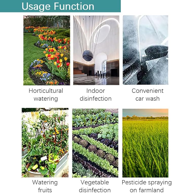 - [Super Power] 7.4V self-priming power with up to three hours of battery life. Equipped with a retractable spray wand (approximately 16.7-32.4 inches) and six different spray heads with adjustable range, it easily adapts to various spraying needs, including gardens, fruit trees, potted plants, high-rise buildings, and ground areas.