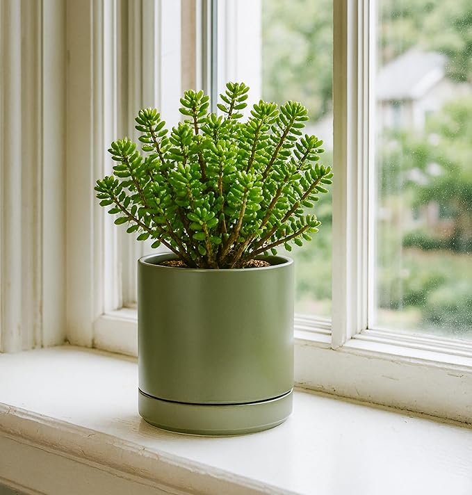 D'vine Dev Set of 2 Plants Pots, 6.5 Inch Ceramic Planter Pot for Plants with Drainage Hole and Saucer, Olive, 94-V-C-J
