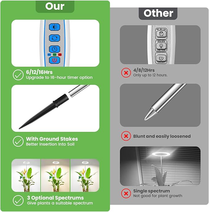 - 5 Level plant Light with Auto Timer: Safeguard plants from light burn using precision dimming (20%-100%) while optimizing spectrum intensity for germination and flowering phases. The upgraded 6, 12, 16H auto-timer eliminates manual adjustments and cuts energy costs by 40%.