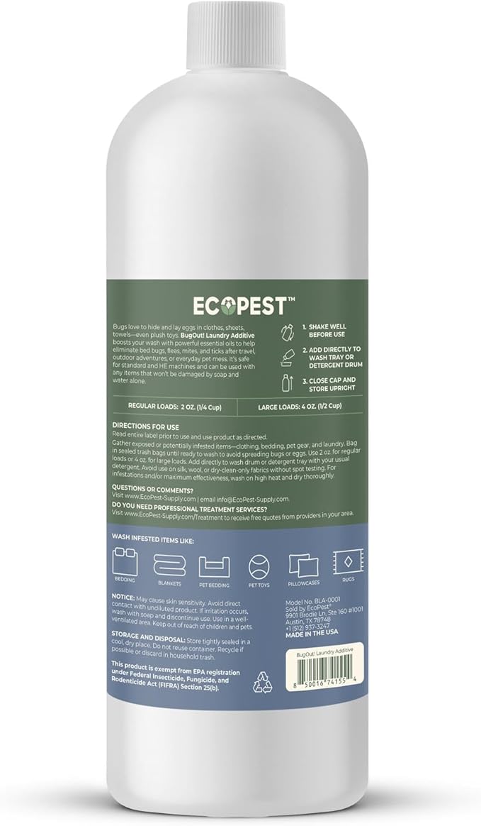 BugOut! Laundry Additive – Natural Detergent Booster for Bed Bug, Mite, Flea, & Tick Treatment & Prevention | Plant-Based Killer, Made with Fabric-Safe Soap | Works in Hot and Cold Wash (32 Oz)