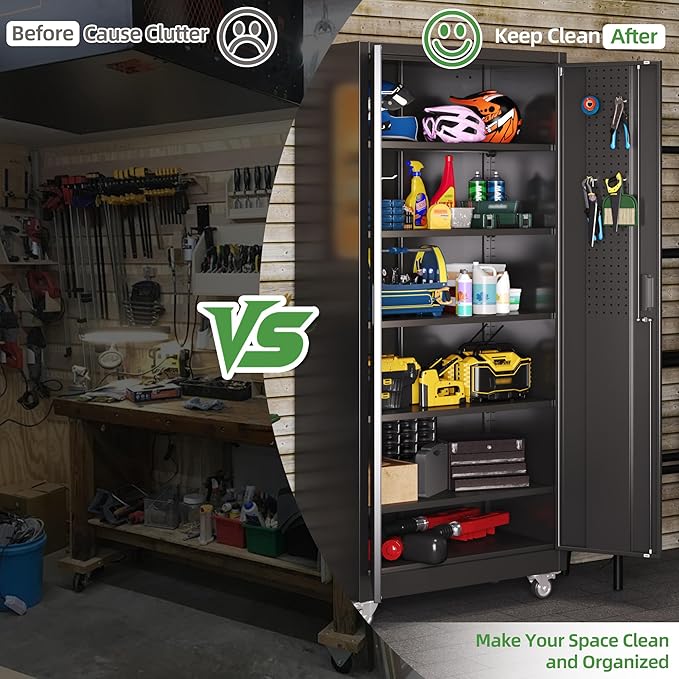 - 2025 Upgrade: The size of garage storage cabinet with wheels is 71"H×32"W×16"D,Not only has the size increased, Pegboard is added to the door to Improve storage diversity.