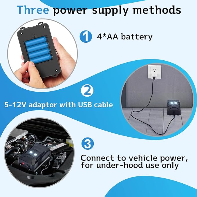 - Three power supply modes: Three charging modes are provided for easy use. 1: Use 4 AA batteries, 2: Use a USB cable to connect to a 5-12V adapter for charging, 3: Use a DC cable to connect to the power supply under the hood of the car