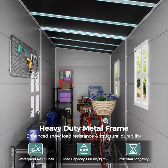- 【Premium and Durable Material】The 14mm tough double-wall resin construction, 0.6 mm galvanized steel frame and impact-resistant floor are designed for long-term durability. The double-wall panels are waterproof and moisture-proof, allowing worry-free use in all weather conditions. It is weather-resistant, waterproof, and UV-resistant-no peeling, rotting, or rusting. The screws are embedded to ensure aesthetics and safety