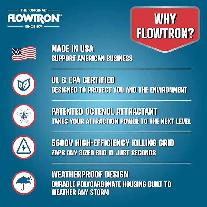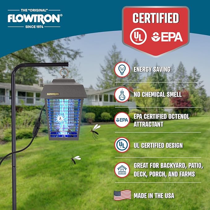 Flowtron Electric Bug Zapper 1/2 Acre Outdoor Insect Control with Dual Lure Method, 15W UV Light & Octenol Attractant for Fly & Mosquito, 5600V Kill Grid, Made in USA, UL Certified - Grey Color